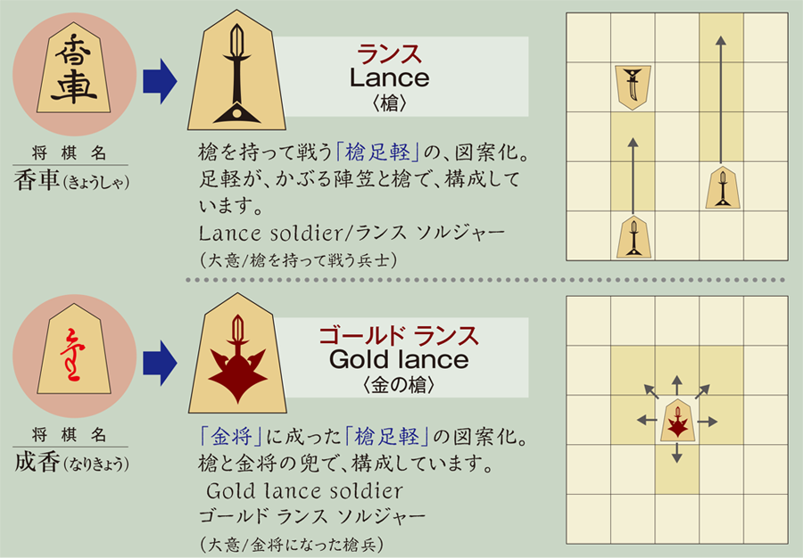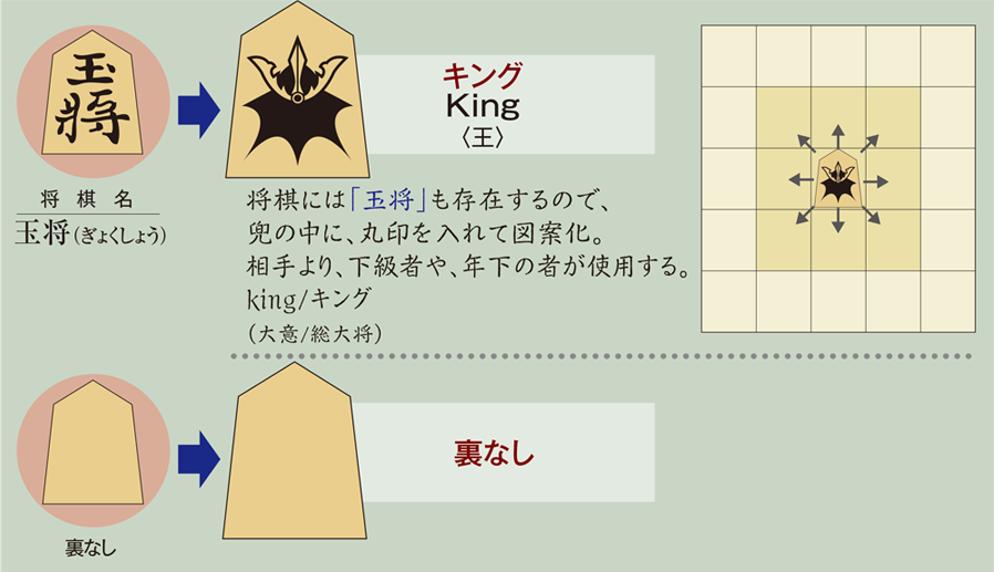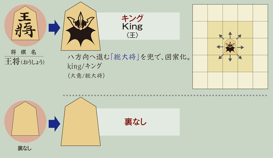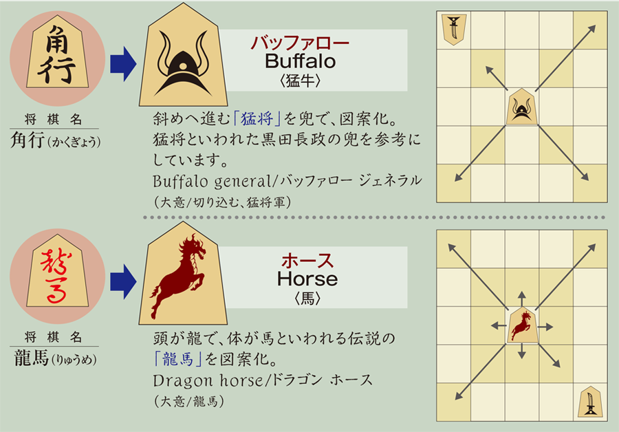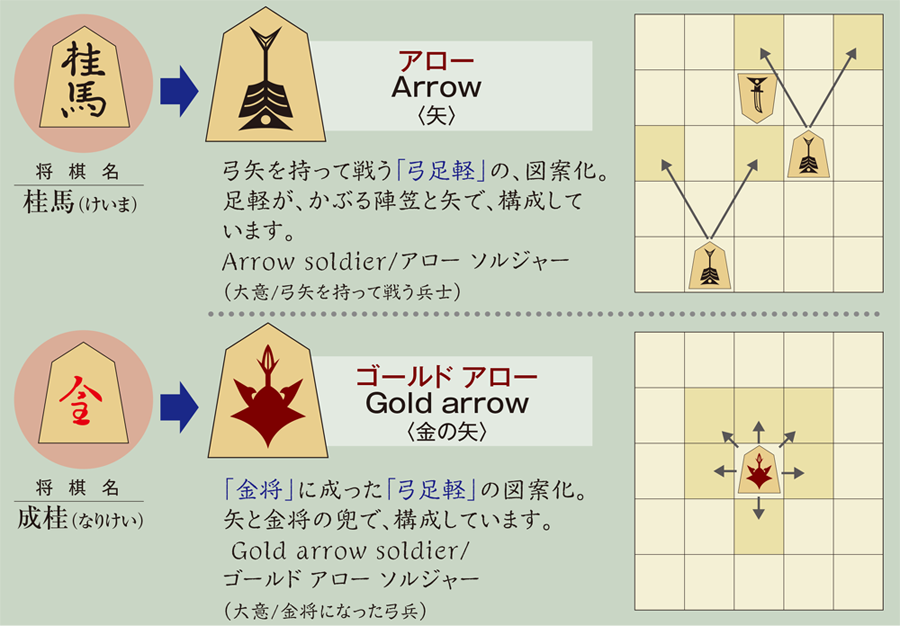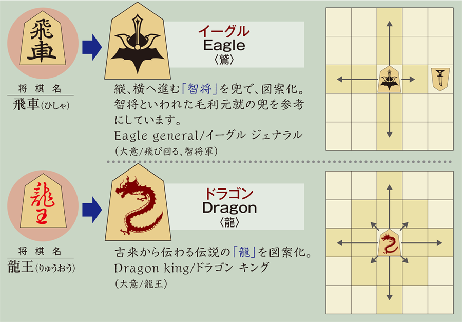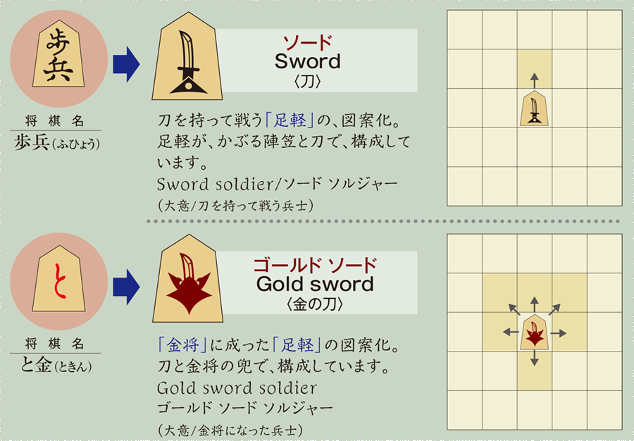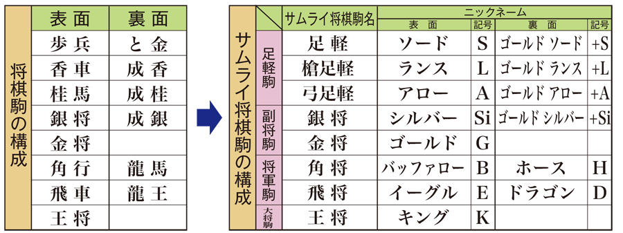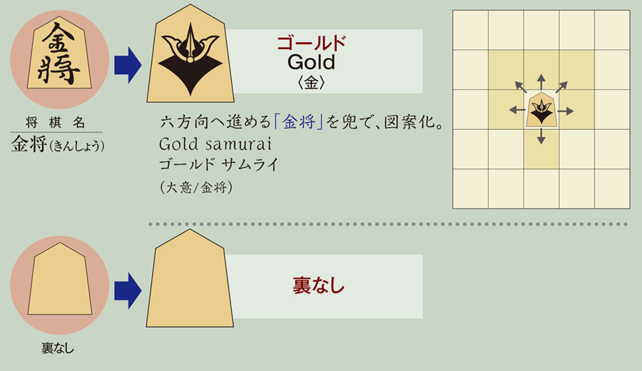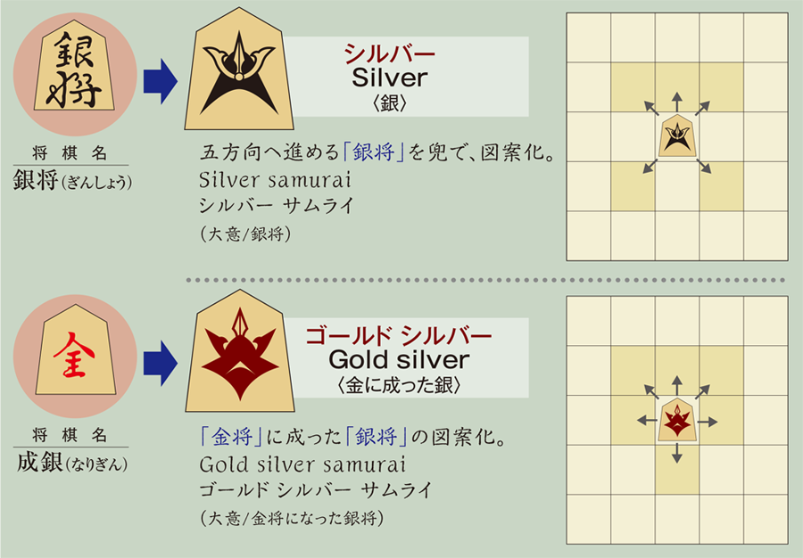 織田信長は、将棋は「陣法を象ったもの」と言って部下の士気を鼓舞する手段として勧めたようです。 「サムライ駒」は、戦国時代の武将の兜や、足軽が使用していた武器を元に図案化して、駒の方向性を示し、また英語によるニックネームをつけて、初めて将棋をやる人や外国の人にも感覚的にも分かるように努めました。